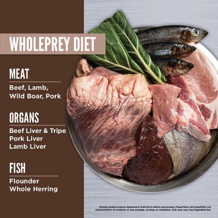 Beef, beef liver, lamb, wild boar, flounder, pork, beef tripe, pork liver, whole herring, lamb liver, pea fiber, bison, lamb tripe, lamb kidney, whole pumpkin, collard greens, whole apples, whole carrots, whole pears, calcium carbonate, bison kidney, bison liver, bison tripe, salt, dried kelp, choline chloride, zinc proteinate, manganese proteinate, copper proteinate, calcium pantothenate, vitamin E supplement, mixed tocopherols (preservative), riboflavin, folic acid, thiamine mononitrate, pyridoxine hydrochloride, rosemary extract, citric acid (preservative).