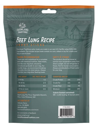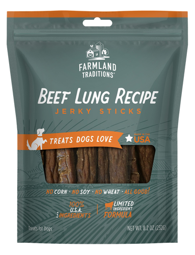 Farmland Traditions Beef Lung Recipe Jerky treats are made in our own U.S. facility using only USA sourced and raised ingredients. Our simple recipe treats contain no corn, wheat, or soy, for a taste your dog is sure to love!