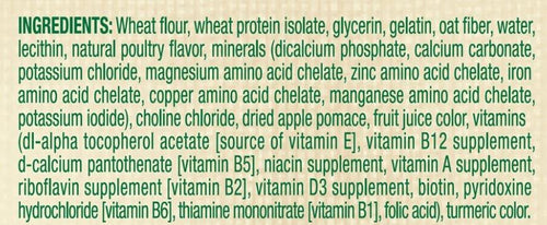 Gelatin, Wheat Protein Isolate, Glycerin, Soy Protein Isolate, Sodium Caseinate, Natural Poultry Flavor, Hydrogenated Starch Hydrolysate, Vegetable Oil (Preserved with Propyl Gallate), Sodium Tripolyphosphate, Lecithin, Ground Flaxseed, Calcium Carbonate, Magnesium Monostearate, Monoglycerides of Edible Fatty Acids, Choline Chloride, Potassium Sorbate (A Preservative), Minerals (Magnesium Oxide, Zinc Sulfate, Ferrous Sulfate, Copper Sulfate, Maganese Sulfate, Potassium Iodide), Vitamins (dl-Alpha Tocopherol Acetate [source of Vitamin E], Vitamin B12 Supplement, Calcium Pantothenate, Niacin Supplement, Vitamin A Supplement, Riboflavin Supplement, Vitamin D3 Supplement, Biotin, Pyridoxine Hydrochloride [Vitamin B6], Thiamine Mononitrate [Vitamin B1], Folic Acid), Chlorophyll.