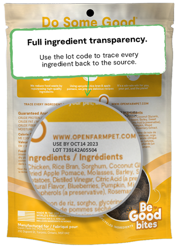 Our Chicken Recipe Soft & Chewy treats are made with humanely raised chicken as the first ingredient, combined with high-quality non-GMO fruits & grains. These treats included 30% upcycled ingredients, making Be Good Bites great for your pup and the planet too!