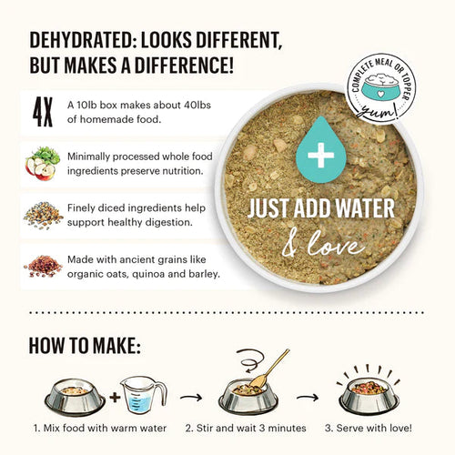 The Honest Kitchen believes human grade, whole foods provide pets the best nutrition possible. This Gourmet Grain recipe is made from ingredients you’d recognize in your own kitchen, like cage free turkey, wild caught fish, organic oats and quinoa—all dehydrated to retain nutrients and taste. Perfect for picky eaters, we add a big burst of flavorful bone broth and leave out the potatoes, peas, lentils, corn, wheat and soy. Just add warm water and wait three minutes for a tasty, homemade meal that you and your pets will love!